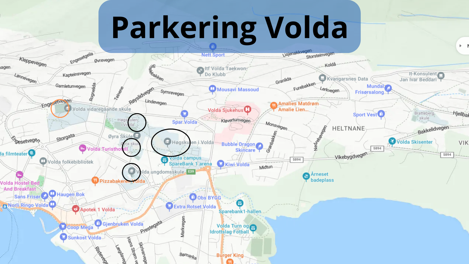 Parkeringane er markert på kartet. I tillegg er der parkeringar ved ymse butikkar og i sentrum. Ber om at besøkande følgjer skilting på alle parkeringar